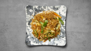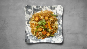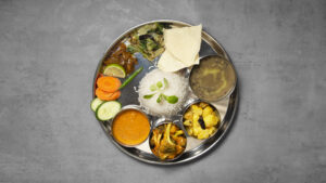 Steamed rice served with seasonal vegetable curry, mixed lentil soup, cumin- spiced ...